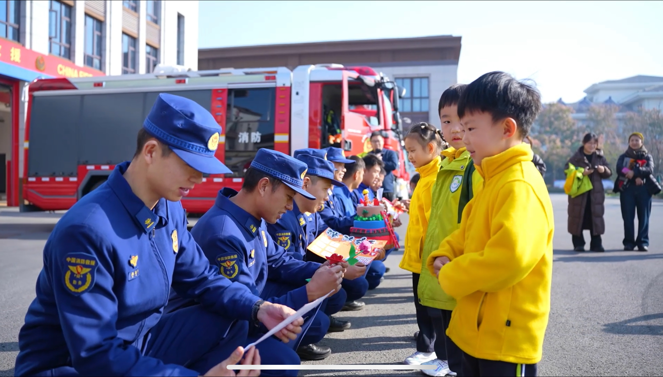 参观尾声温情满满,孩子们将提前准备好的礼物送到消防员手中。“叔叔,谢谢你们!”“你们是我心中的大英雄!”纯真的话语传递着深深敬意。消防员感动地蹲下与孩子们交流,一张合影,定格了这份“爱与守护”的双向奔赴。