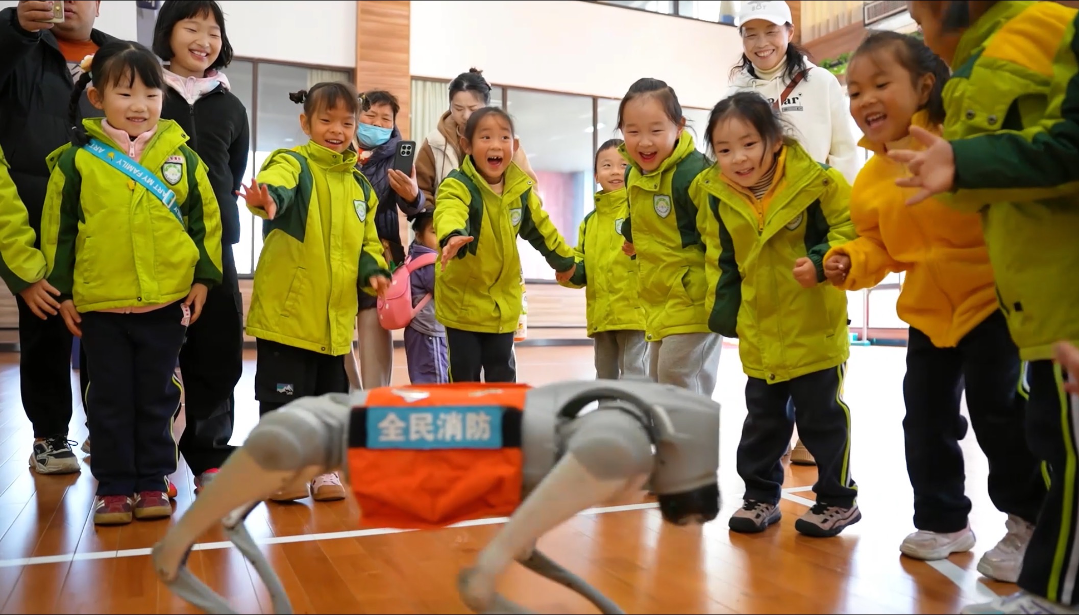 活动首站,孩子们满怀好奇地走进宿迁市湖滨新区消防救援大队。在消防员的专业讲解和引导下,他们近距离观摩了各种消防车辆和装备器材,并试穿厚重的消防防护服。与机器狗的互动将气氛推向了高潮,孩子们围着它连连欢呼“好酷”。参观整洁的宿舍时,棱角分明的“豆腐块”被子也让大家直观感受到了消防员严谨的作风。