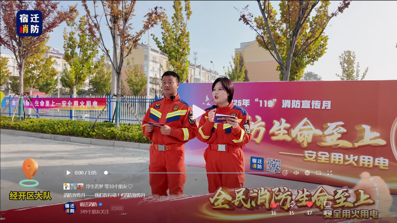 中国江苏网11月25日宿迁讯 为扎实推进“119”消防宣传月工作,全面提升社会火灾防控综合能力,宿迁经开区消防救援大队立足“贴民生、接地气、重实效”原则,创新宣传策略、丰富活动形式,在增强宣传吸引力、强化内容感染力、落实工作推动力上精准发力,有效提升全民消防安全素养,掀起全域覆盖、全民参与的消防宣传高潮。