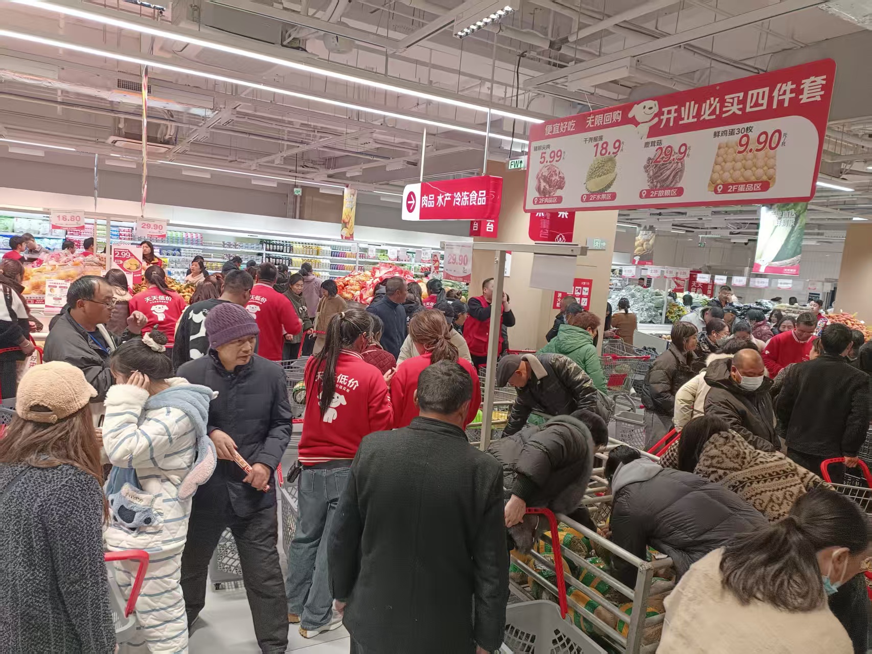 开业当天早晨7时起,超市门口便已排起长队,众多市民提前到场,期待成为首批顾客。卖场内人头攒动,气氛热烈。生鲜蔬果、休闲零食、肉品水产等区域聚集了大量消费者,反映出市民对高品质、高性价比消费场景的旺盛需求。丰富的开业优惠活动,进一步激发了市民的购物热情。
