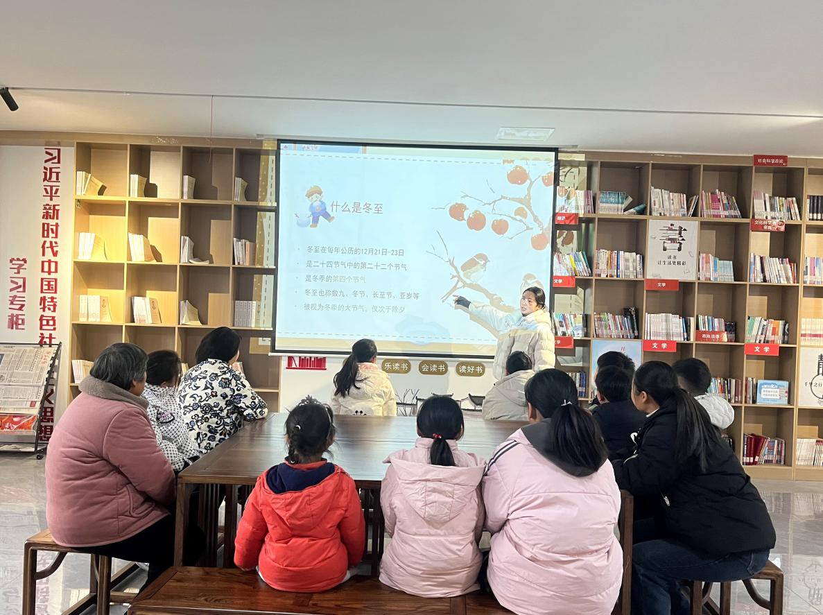 在详细介绍冬至节气的由来后,志愿者们带领孩子们齐声诵读经典,杜甫《冬至》中的沉郁情怀与“邯郸驿里逢冬至,抱膝灯前影伴身”的思乡之绪交替回荡,孩子们抑扬顿挫的诵读声,让千年诗句中的冬至意蕴鲜活起来。志愿者逐句讲解诗歌背景,引导孩子们体会古人对节气的感悟与对团圆的期盼,在诵读中传承文化基因。