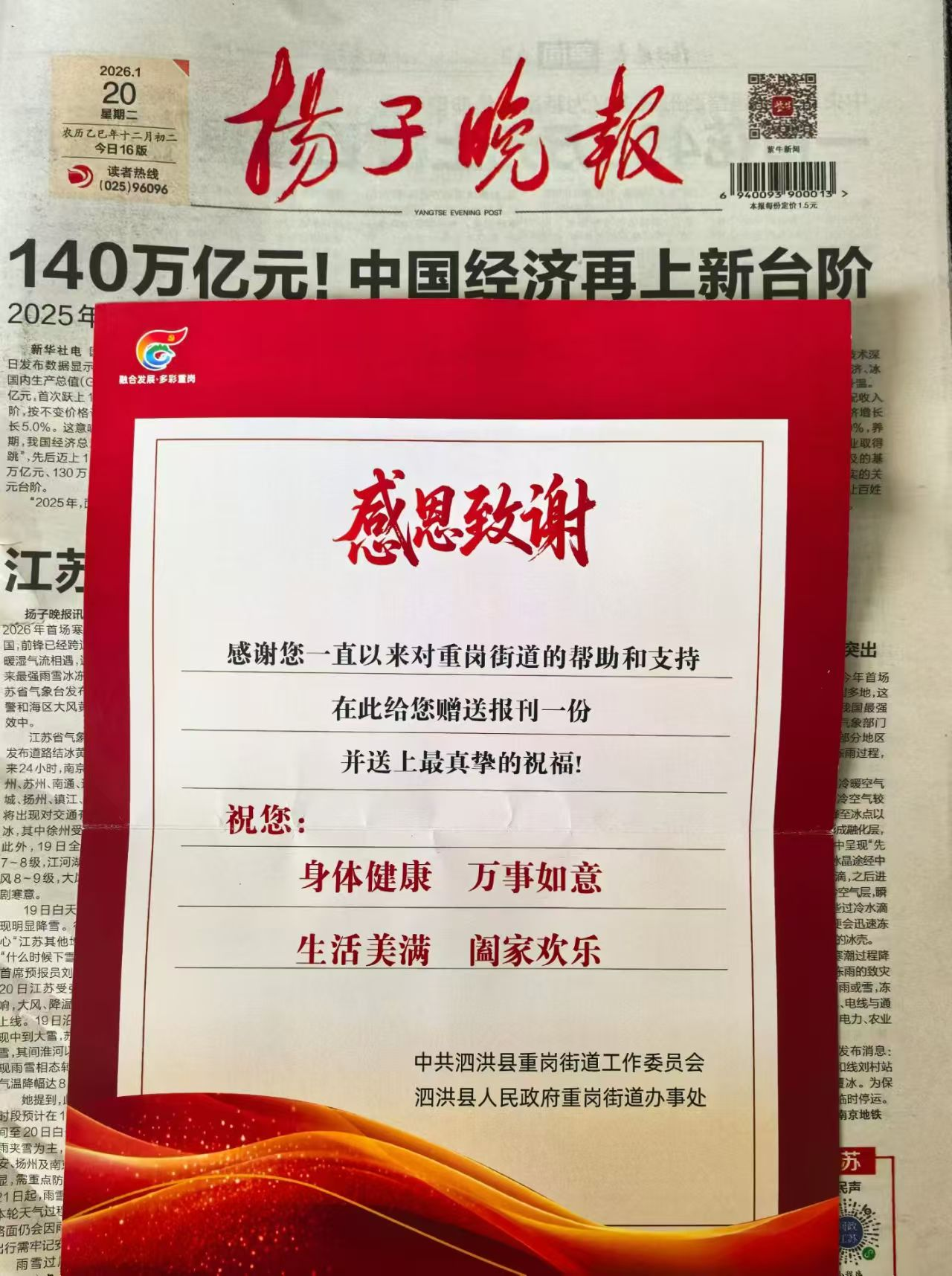 中国江苏网1月23日宿迁讯 近日,泗洪县重岗街道开展了送报活动,成为连接地方与乡村能人情感的一道温馨桥梁。通过为辖区内文化名人、非遗项目负责人、民族和宗教界人士代表、部分退役军人、县级以上人大代表、政协委员等群体提供个性化送报上门服务,不仅传递了资讯,更送达了家乡的惦念与敬意。