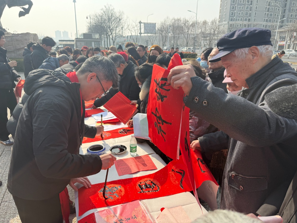 当天的活动现场,墨香与年味交织成最动人的新春图景。书法家们摆开笔墨,现场写联送福,市民们围在一旁,挑一副心仪的春联,沾沾新春的福气。