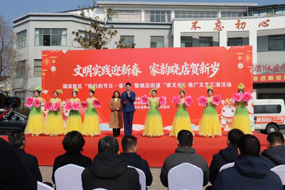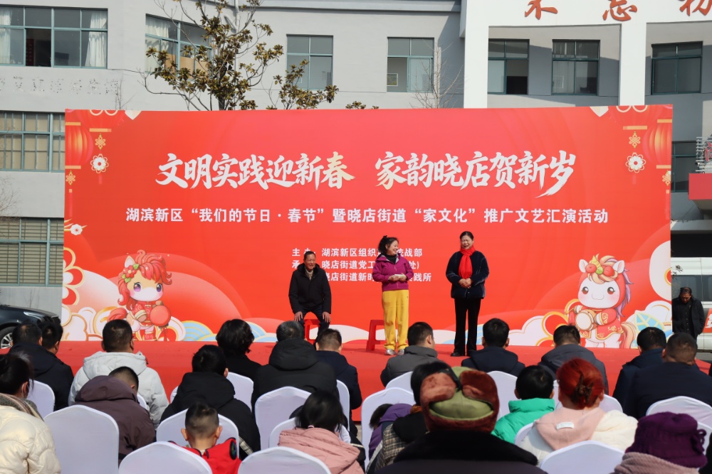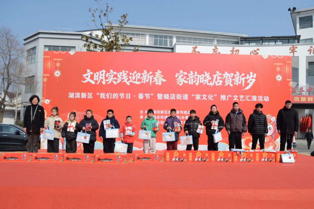 随着喜庆热闹的舞龙舞狮上演,文艺汇演正式拉开帷幕。舞蹈《马踏山河》、快板《德善晓店·文明之家》、小品《老人也需要关爱》、歌舞《我和我的祖国》轮番演绎,以各具特色的艺术表达串联起“家”与“国”的深厚情怀,赢得现场观众阵阵掌声。其间,晓店街道党工委书记贺恒春上台发表致辞,向辖区全体居民致以最诚挚的新春祝福并阐释街道“家文化”建设的重要意义。湖滨新区党工委委员、管理办副主任、组织宣传统战部部长单梅为辖区未成年人代表送上书籍、学习用品、年货等节日慰问,鼓励他们努力学习,成长为有担当的栋梁之材。返乡代表宣读《全市乡村“文明安全过大年”倡议书》,号召大家以干净整洁的环境、文明安全的生活方式共同度过一个温馨、幸福、欢乐的新年。