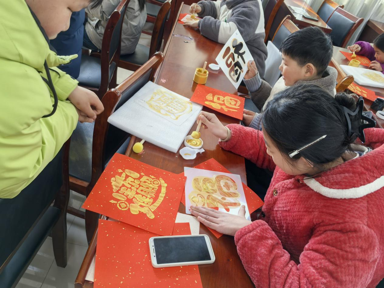 拓福字,指尖传承非遗。在非遗拓印环节,志愿者提前备好红纸、墨碟、拓包,并向孩子们演示传统拓印技艺:上墨、铺纸、按压、揭模……不一会儿,圆润饱满的“福”字跃然纸上,龙凤呈祥、锦鲤送福等吉祥纹样更添喜气。孩子们迫不及待动手尝试,不一会儿,孩子们举起自己的拓印作品欢呼:“快看,我的福会发光!”欢声笑语中,百余张红彤彤的福字铺满桌面,映照着张张笑颜。