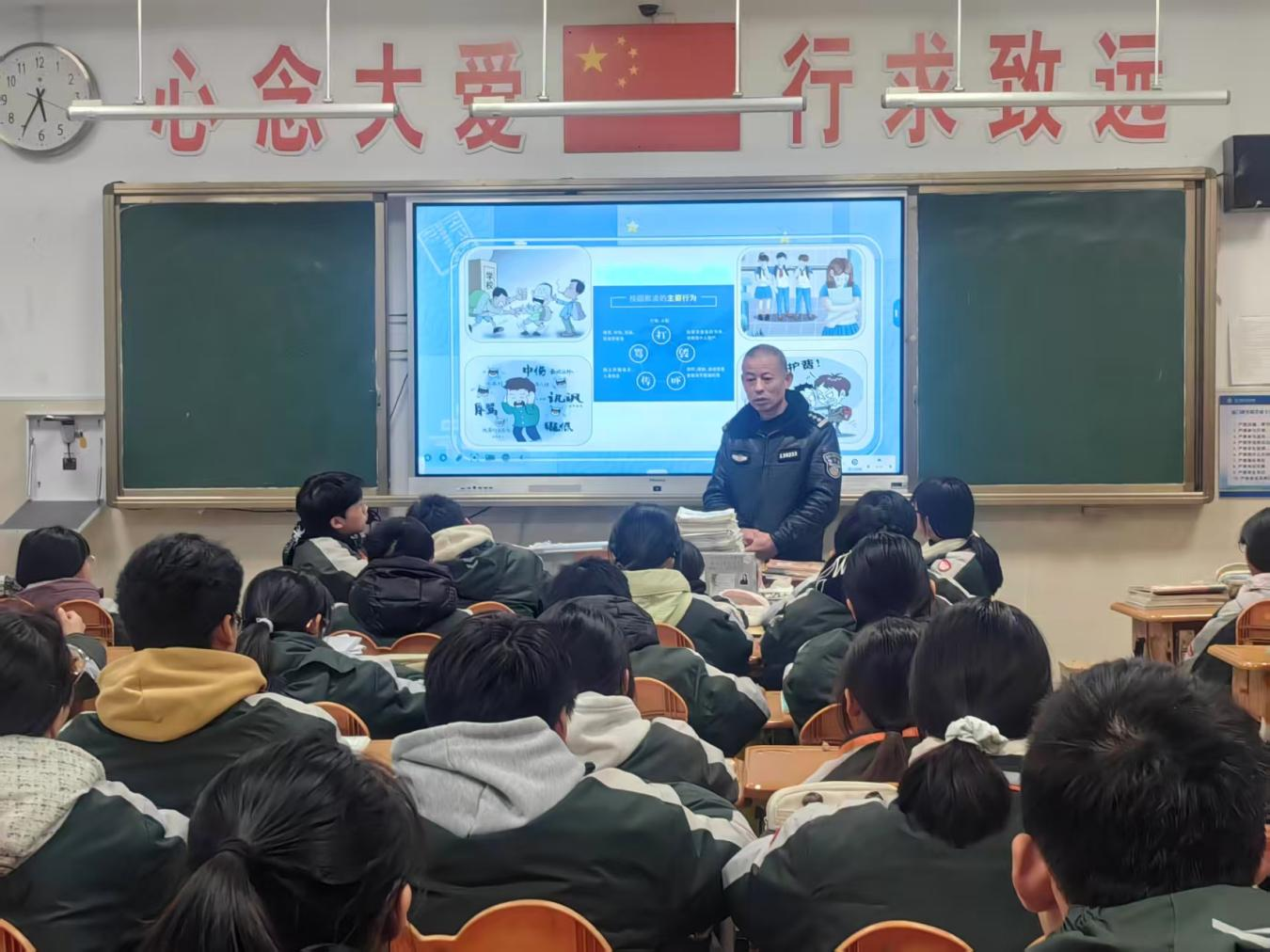 驻校警官不仅要“驻”在校园,更要“专”于履职。他们化身法治辅导员,将《中华人民共和国治安管理处罚法》《中华人民共和国预防未成年人犯罪法》等法律知识转化为生动案例,有效提升学生的法治意识和自护能力。作为矛盾调解员,他们及时介入化解涉校矛盾纠纷,对需要重点关心的学生,开展“一对一”谈心、帮扶教育等措施。同时,面对突发警情,他们第一时间介入处置,将安全防线延伸至校园每一个角落。