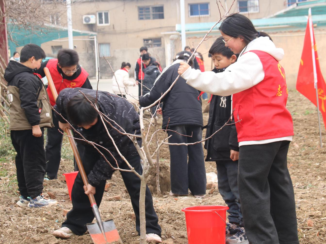 植树现场,暖意融融、干劲十足。在志愿者的协助下,曹庙中学的同学们成为栽树的主角,大家分工协作、默契配合,挥锹铲土、扶苗填坑、提水浇灌,每一个环节都认真细致。他们撸起袖子不顾鞋裤上的泥土,汗水挂满额头却毫不在意,互相加油鼓劲。欢声笑语间,一株株桃树、梨树树苗被悉心栽下,错落有致地挺立在校园沃土上,原本空旷的土地焕发出勃勃生机,为春日校园增添了一道亮丽的风景线。