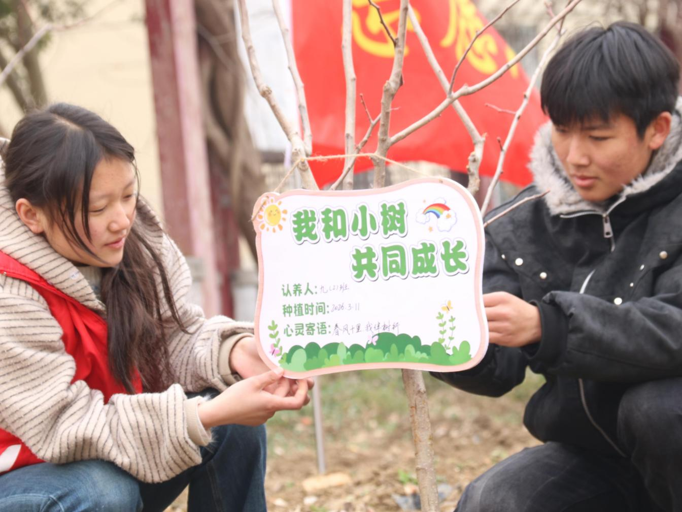 植树环节结束后,活动迎来充满仪式感的时刻。同学们领取专属认养牌,工整地写下自己的姓名和寄语,“我和小树 共同成长”的字样在阳光下熠熠生辉。同学们小心翼翼地将认养牌挂在自己亲手栽种的树苗上,并与“新伙伴”合影留念。“今天我种下的是桃树,挂上认养牌的那一刻,我感觉自己多了一份责任。”一名七年级学生说道。小小的认养牌,既是与小树的成长约定,更是一份责任与担当的传递,让同学们在呵护绿色的过程中,学会珍惜生命、懂得坚持与守护。