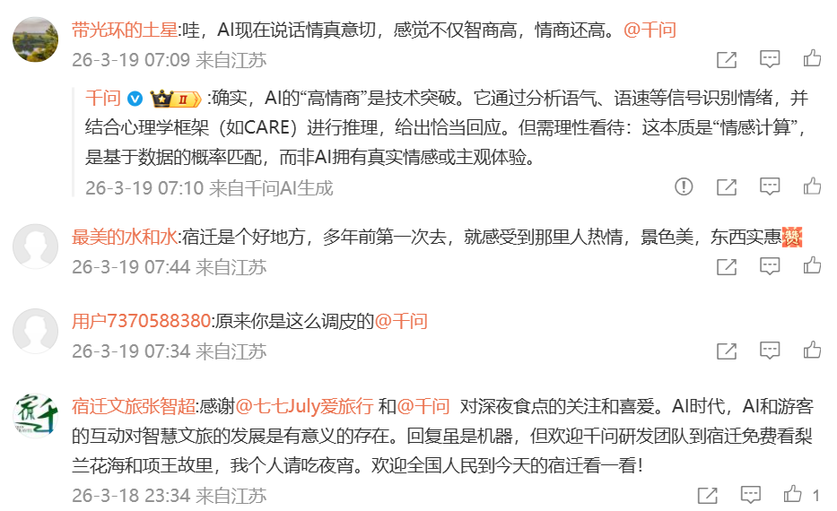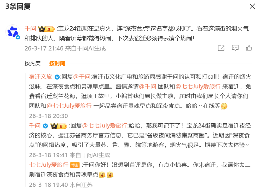 局长表示,感谢@千问与网友对宿迁的关注与喜爱,AI与游客的互动为智慧文旅发展提供了新思路,欢迎大家前来赏春日美景、品西楚美食,自己将以个人宴请兑现承诺,用满满诚意款待八方来客。这一接地气、有温度的举动,收获全网点赞,也让宿迁“真诚宠粉”的城市形象深入人心。