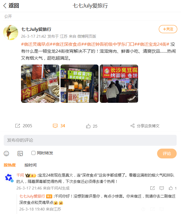 此次出圈源于旅行博主@七七july爱旅行的实地探店,她走进宿迁宝龙24街,用镜头真实记录下街区灯火璀璨、食客云集的热闹场景,香气四溢的夜宵、络绎不绝的人流,尽显城市夜经济活力。这条充满生活气息的内容一经发布,便引发广泛关注,@千问官微第一时间跟帖互动,直言宝龙24街人气爆棚,“深夜食点”已然成为网络热词,隔着屏幕都能感受到满街烟火气,还与博主相约二刷宿迁,共品特色美食。