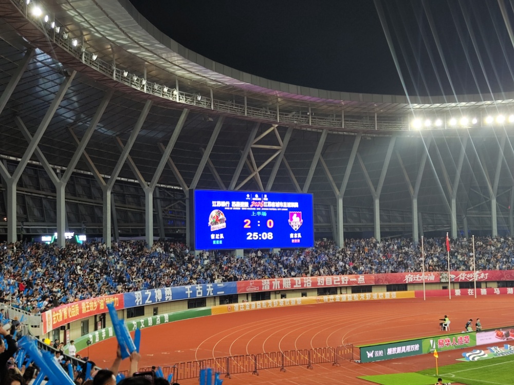 中国江苏网4月18日宿迁讯 “霸王”来了!宿迁队火力全开。4月18日晚,在宿迁梦之蓝·奥体中心,2026“苏超”第二轮赛事中宿迁队坐镇主场迎战南京队。当晚,曾在荧幕上再现西楚霸王形象的何润东,身披战甲亮相赛场,燃爆全场!开场仅几分钟,宿迁队19号球员张桐瑞就破门得分,宿迁队1:0领先南京队。宿迁队收获2026“苏超”首粒进球!