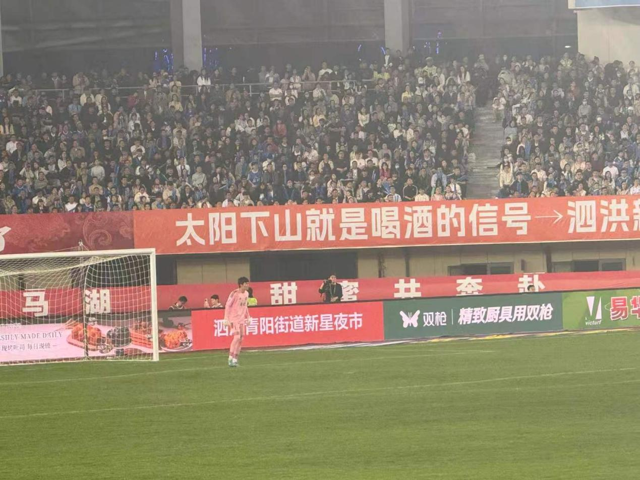 赛场之上,一条印着“太阳下山就是喝酒的信号 泗洪新星夜市”的横幅与“宿迁加油,你的东来了”的宣传横幅惊喜同框。网友感叹:本土夜市能和京东并肩亮相,既让“苏超”赛场多了几分烟火气,也让咱们本土小微企业狠狠刷了一波存在感。