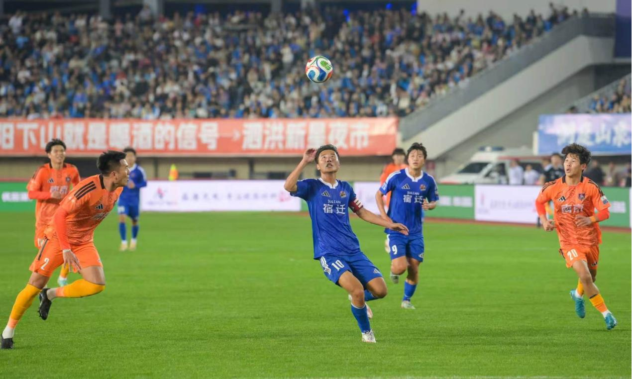 中国江苏网4月20日宿迁讯 4月18日晚,“苏超”宿迁队主场迎战南京队,最终以2∶0斩获了新赛季首胜,让现场及屏幕前的球迷热血沸腾。