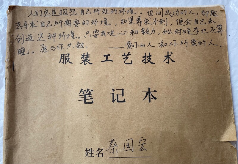 2009年夏天,他对我说,他对服装感兴趣,想去学习,我立即表示支持。我在他的《服装工艺技术》笔记本上,写了这样的一段文字:“人们总是抱怨自己所处的环境。世间成功的人,都能去寻求自己所需要的环境;如果寻求不到,便会自己去创造这种环境。只要有决心和毅力,什么时候学也不算晚!愿与你共勉。落款:爱你的人和你所爱的人。”