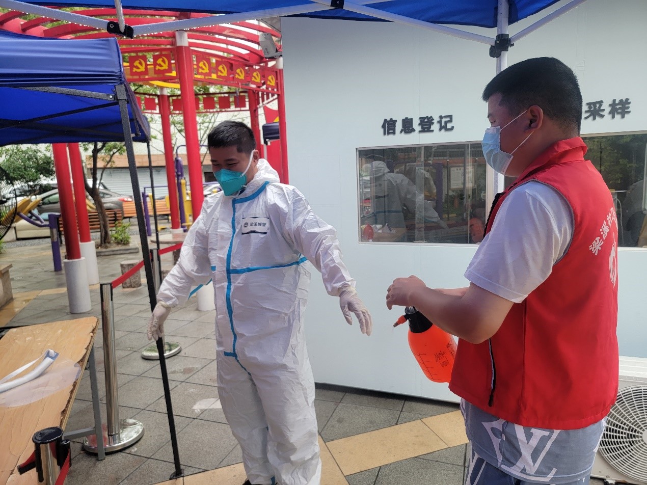 凌晨5点,10名城管队员换好防护服,开始进入小区开展防控工作。虽然天刚蒙蒙亮,但是30多度的高温加上密不透风的防护服,不一会儿大家的衣服就已经湿透了。连续五六个小时高强度的“扫楼”工作,每分每秒都在考验着队员们的意志。终于,过了中午,第一批参与扫楼的队员被替换下来休息调整,防护服脱下来后,整个人都像是从水里捞出来一样,有的队员甚至一口气喝掉了三瓶水……下午四点多,由于人员力量捉襟见肘,10名队员还没来得及睡上一觉,便接到指令,需要集中封闭管理,直到任务结束。“好的,马上就到!”尽管队员们的身体还很疲惫,换洗的衣物也没带齐,刚洗干净的制服还没有干透,但疫情就是命令,10名突击队员在中队长的战斗动员后,立即奔赴高风险小区,跟高温搏斗,与病毒“赛跑”。