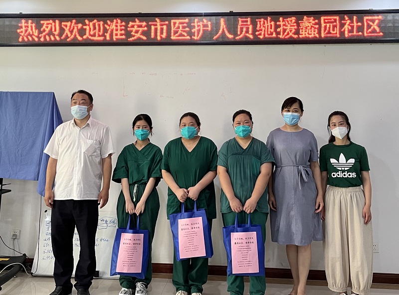 7月9日起,淮安市淮北区派遣蒋琪、蒋丹和李姗姗3名医护人员支援蠡园社区全员核酸检测工作,社区为欢迎她们的到来进行了简单的欢迎仪式和送上一份慰问礼品。当这些全副武装的“大白”出现在核酸检测现场时,排队等候的居民自发集体鼓起掌来,感谢远道而来支援无锡的淮安朋友。