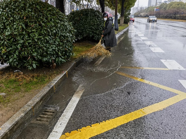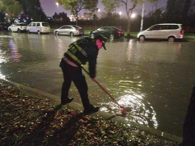 线下巡防,保障市民出行安全。建立巡查机制,成立巡查队伍,对易发生灾害的路段、部位,划定责任区域,明确责任人,24小时待命。同时,做好机械、车辆等应急物资的储备工作,为应急救援提供强有力的保障。针对辖区内地势低洼、易积水点进行全面排摸和定点巡查,第一时间组织队员冒雨上路排查积水,疏通雨水篦和下水道,并在重点路段、主要桥梁附近摆放锥桶与警示标志,提醒过往行人绕道行驶。