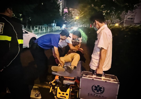 沈春美同志边给老人擦汗边询问老人:“大爷,我们是社区工作人员,您是摔跤了,还是身体不舒服?”老人说自己有心脏病,白天还拉肚子,晚上走着走着身体就坚持不住了。联系老人家属得知赶过来至少还需要20分钟,小沈赶紧买了瓶水给老人补充水分,陆队立即拨打110、120联系救护车到场。