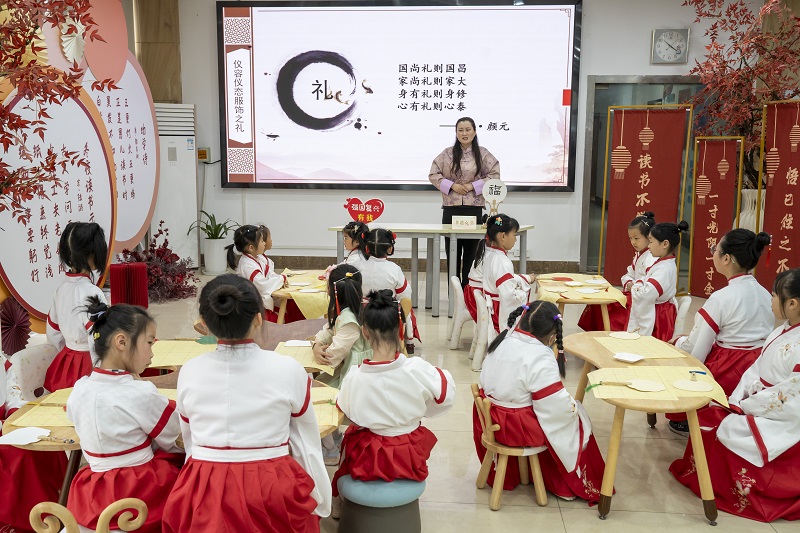着华夏汉服,彰礼仪之美。在讲述揖礼的背景与基本动作之后,老师轻轻吟唱着礼仪之歌,带领女孩们行国学礼,引导她们从仪容、仪态和服饰之礼三个方面感悟“礼”字在国学传承中的分量。