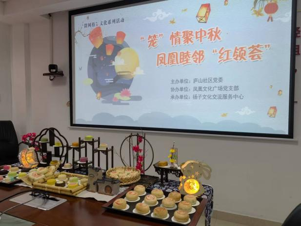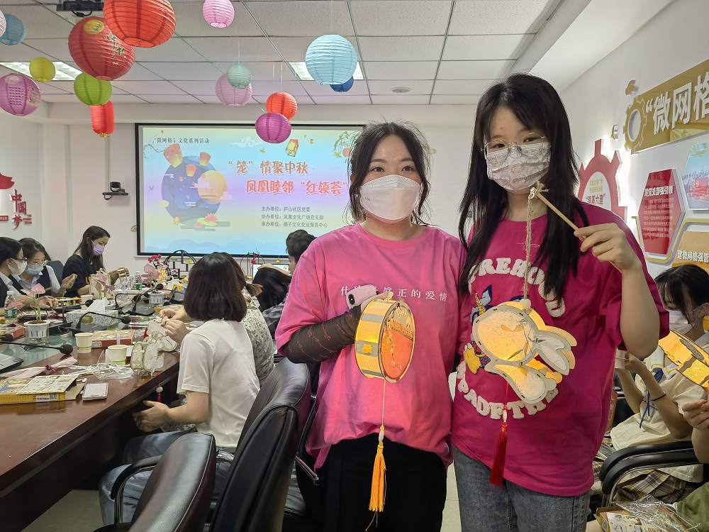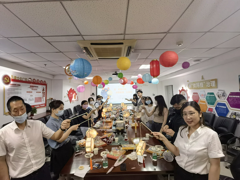 企业楼宇:9月9日下午14:30,为加强企业与企业之间凝聚力、加强企社联动,社区与各合作企业携手在凤凰文化开展中秋文化活动,活动内容包括扎花灯、吃月饼等。制作花灯环节,工作人员将事先准备好的花灯制作材料发给居民,并详细讲解花灯制作方法和注意事项。居民们听完讲解,兴致勃勃地开始动手,通过剪、贴、挂等方法沉浸式投入制作中。大家一边制作一边交流,活动现场欢声笑语、其乐融融。经过近一个小时的努力,一盏盏漂亮精巧的花灯很快成型,闪烁的鹅黄色光亮为人们带来温暖美好。