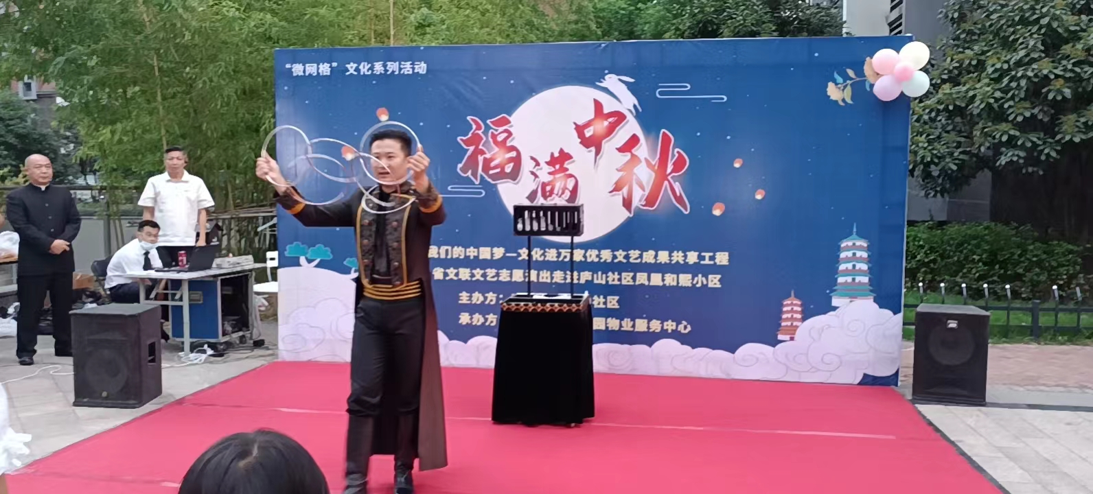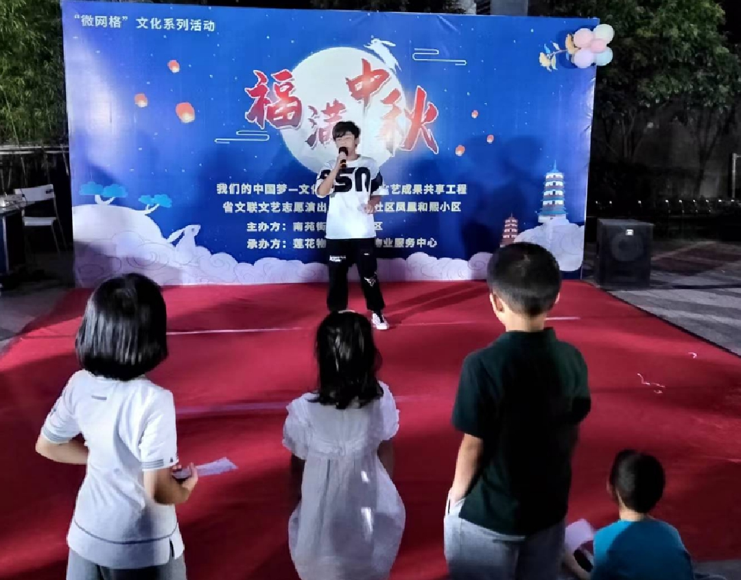 青年才艺:活动当天,莲花物业公司为即将登台表演的老少青年们准备了崭新的舞台和极佳的音响设备。社区内的居民自发组织、排练了一出出好戏,有歌舞、相声、杂技等节目,令人目不暇接。天虽然暗了下来,但居民热情不减,一声声喝彩为中秋前夜的凤凰和熙营造出浓厚团圆温馨的氛围。