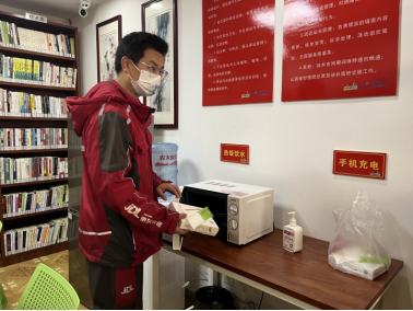 在介绍完驿站功能后,快递小哥自助加热午餐,大家各自选择区域就餐,其乐融融,暂时舒缓了工作的劳累。