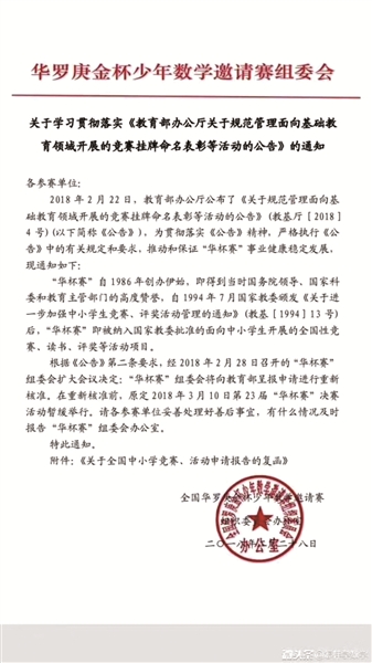 中国江苏网讯 前天,一条关于“华杯赛”的重磅信息开始在朋友圈和微博上风传:原定于2018年3月10日举行的第23届“华杯赛”决赛活动暂缓举行,同时被传的,还有一张落款为“全国华罗庚金杯少年数学邀请赛组织委员会”的通知。记者昨天经过多方核实,确定有着奥数竞赛标杆地位的“华杯赛”暂缓进行了!