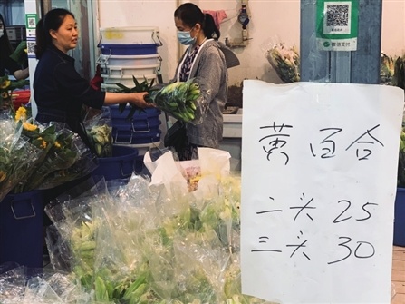 除了夏天最应景的荷花,吕紫红还进了不少初夏盛放的花品。白色的栀子花在繁茂的绿叶衬托下显得清新典雅。隔着口罩,栀子花淡淡的香气仍沁人心脾。此外,多头玫瑰和百合也开出了不少花苞,花香淡淡飘散。记者看到,三头黄百合售价为30元10支。记者 薛卿
