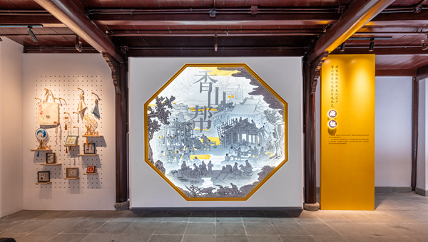 位于南新街69号的承裕堂,是一处始建于清末的古建老宅,如今变身为香山帮非遗艺术馆。步入门厅,一个巨大的多边形镂空装置映入眼帘,生动再现了香山帮营造重要史迹的场景。两侧陈列着香山帮代表性建筑模型,如北京天安门、拙政园芙蓉榭等,让人直观感受其巧夺天工的技艺。往里走,锯、刨、泥刀等工具有序摆放,配合介绍文字,生动阐述着木作、水作、石作、油漆等香山帮八大作的智慧。艺术馆负责人沈佳佳介绍,该馆在保留承裕堂建筑风貌的基础上,引入国家级传承人薛林根大师工作室、非遗工坊、非遗论坛、艺术家沙龙等内容,全方位展示传统建筑美学。