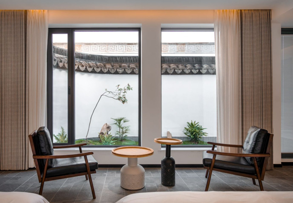 承裕堂对岸,沿着老街往西走,就能看到最新落成的结庐·黎里民宿。其同样由老宅改建而成,是一个集住宿、体验、文化于一体的沉浸式体验空间。“我们在施工建造时,秉持‘修旧如旧’‘新旧共生’的理念。”项目施工经理杨泽尧说,民宿在保留木结构老房子古朴风貌的同时,新增多功能活动区、茶室等公共空间,并融入宋式美学韵味,为游客提供高品质的居住体验。