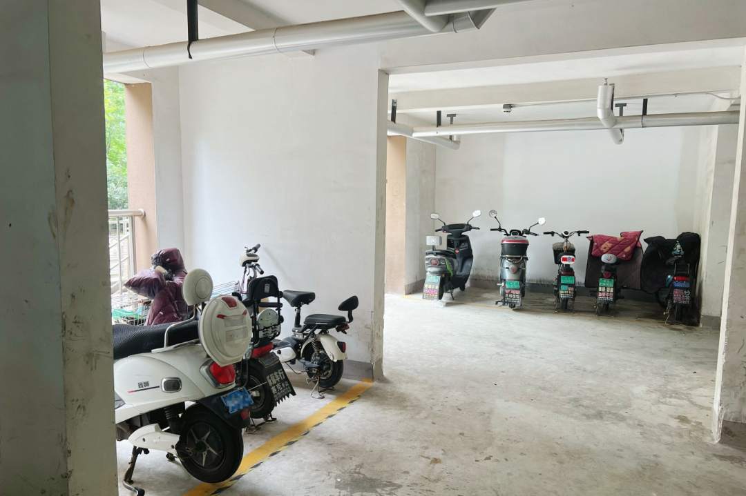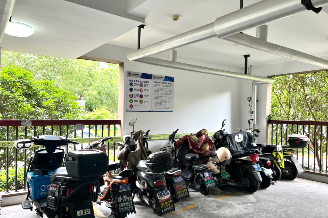 此次架空层改造以消防安全为基石,创新引入消防“新三件套”设备,配合全域覆盖的自动喷淋系统与防火墙隔断,形成“感知-响应-阻隔”立体防护体系。在空间资源有限的条件下,通过模块化布局与精细化划分,分别打造出徐公桥花园可容纳约370辆(6个架空层)、庞家浜新村可容纳约200辆(6个架空层)的电动自行车标准化停放区,既确保绿色通道畅通,又真正实现居民停车充电规范化。