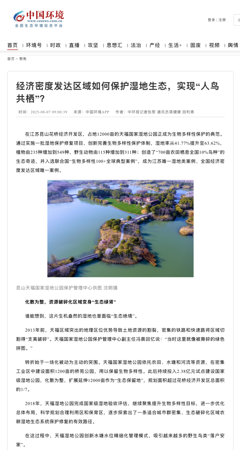 转折始于一场化被动为主动的突围。天福国家湿地公园依托农田、水塘和河流等资源,在密集工业区中建设面积1200亩的桥苑公园,用以保留生物多样性。此后持续投入2.38亿元试点建设国家级湿地公园,化散为整,扩展延伸12000亩作为“生态保留地”,规划面积超过花桥经济开发区总面积的1/7。2018年,天福国家湿地公园完成国家级湿地验收评估,继续聚焦提升生物多样性目标,进一步优化总体布局,科学规划合理利用区和保育区,逐步探索出了一条适合城市群密集、生态破碎化区域农耕湿地生态系统保护修复的有效路径。