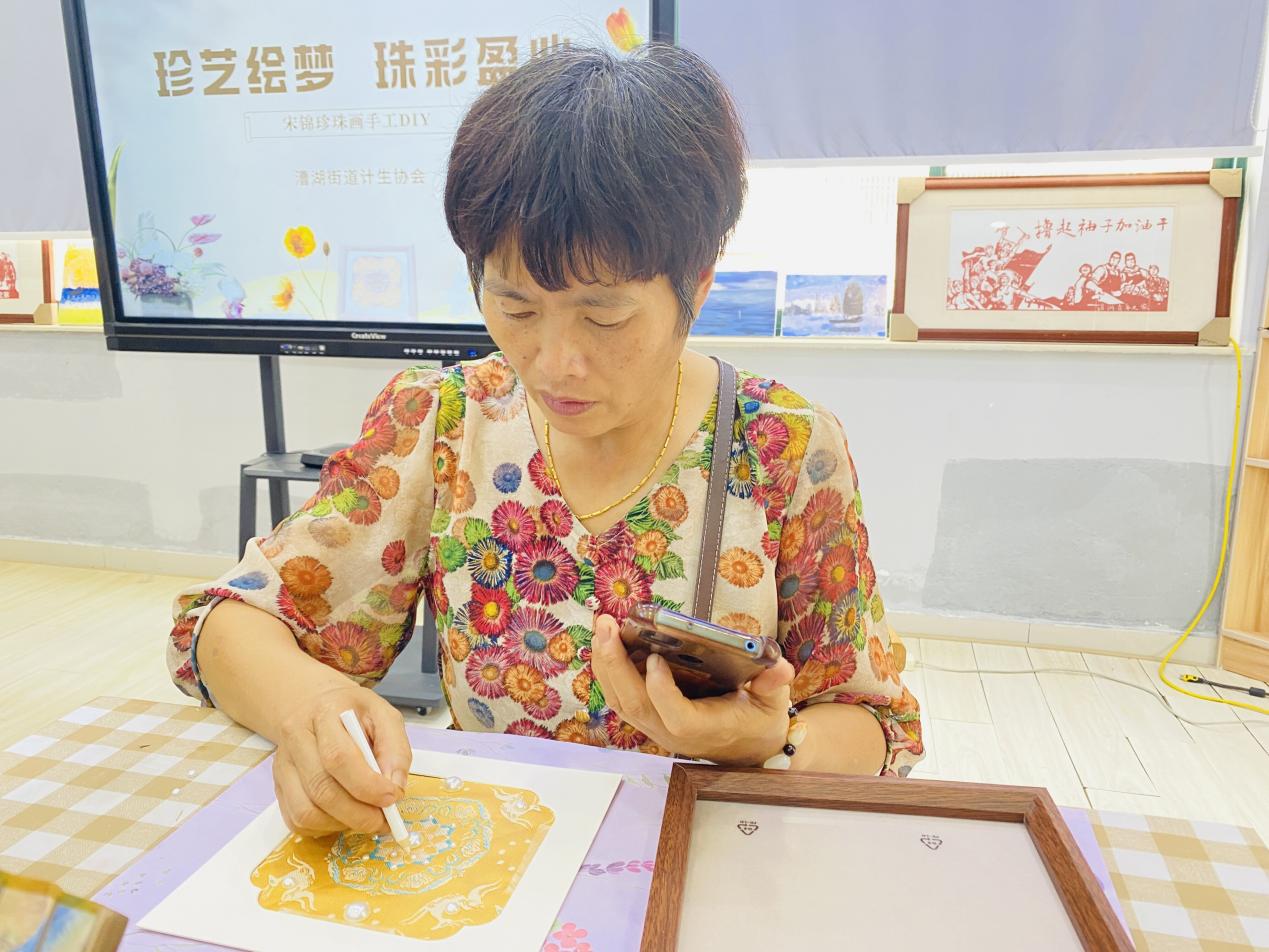 随后,老师又详细科普了珍珠画的制作技巧。珍珠,作为有机宝石,其温润的光泽和独特的质感,与华美的宋锦底布相得益彰。在老师的悉心指导下,居民们从设计构图开始,小心翼翼地用镊子将一颗颗小巧的珍珠、米珠,依循画稿,粘合在精美的宋锦底布上。整个过程需要极大的耐心和专注,现场氛围宁静而温馨,只听见珠粒轻落和相互鼓励的细语。