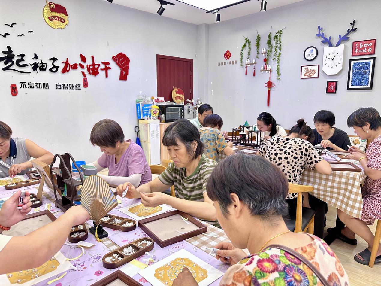 一幅幅作品在居民们的巧手下逐渐成型:有的创作了寓意“花开富贵”的牡丹图,有的拼贴出“平安喜乐”的字样,还有的发挥想象,构成了抽象写意的现代图案。宋锦的华美纹理与珍珠的莹润光泽交织在一起,每一幅作品都独一无二,凝聚了创作者的心血与情感。