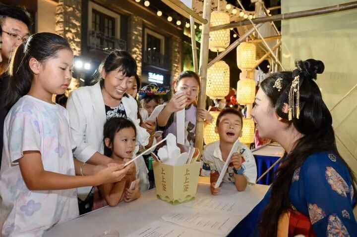 多彩市集里一片流光溢彩:镂叶邀月的雅致、折桂簪秋的浪漫、妙笔生花的文气等,交织出浓浓的节庆氛围;灯谜区人头攒动,“嫦娥奔月”游戏区热闹欢腾,智慧的火花在欢声笑语中迸发;气球魔幻秀将平凡的惊喜幻化于指尖,引来阵阵惊叹。在这灯火可亲、人间团圆的温馨画卷里,大家看到了一个山河锦绣、物阜民丰的时代,正绽放着盛世繁华最生动的注脚。
