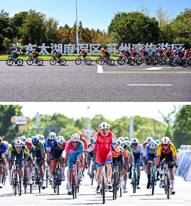随着发令枪响,138名参赛运动员飞驰而出,一路南行,先后经过苏州湾文化中心、苏州湾体育公园、苏州湾梦幻水世界、王焰温泉酒店、东太湖驿站等地标,全线既可领略独具特色的滨水人文景观,也可将风光旖旎的太湖风貌尽收眼底,迎面的湖光山色、远眺的人文建筑与驰骋的车轮相互交融,共同勾勒出东太湖畔生态宜居的美好画卷。