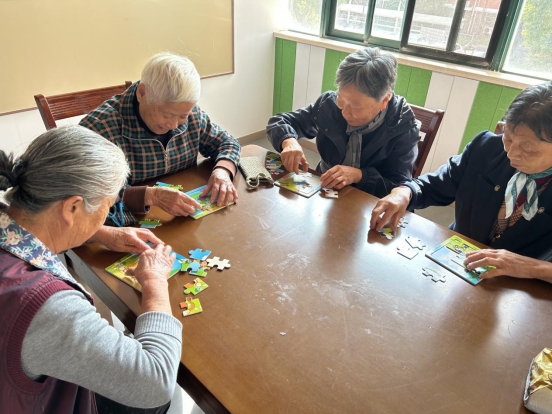 拼图活动中,老人们两两合作、三五成群,有的戴着老花镜认真比对,有的互相提醒、默契配合。金阿姨和付阿姨一边拼着“熊猫图”,一边聊起往事;近八十的曹老伯独自挑战一幅山水拼图,每拼对一块都笑得像个孩子。