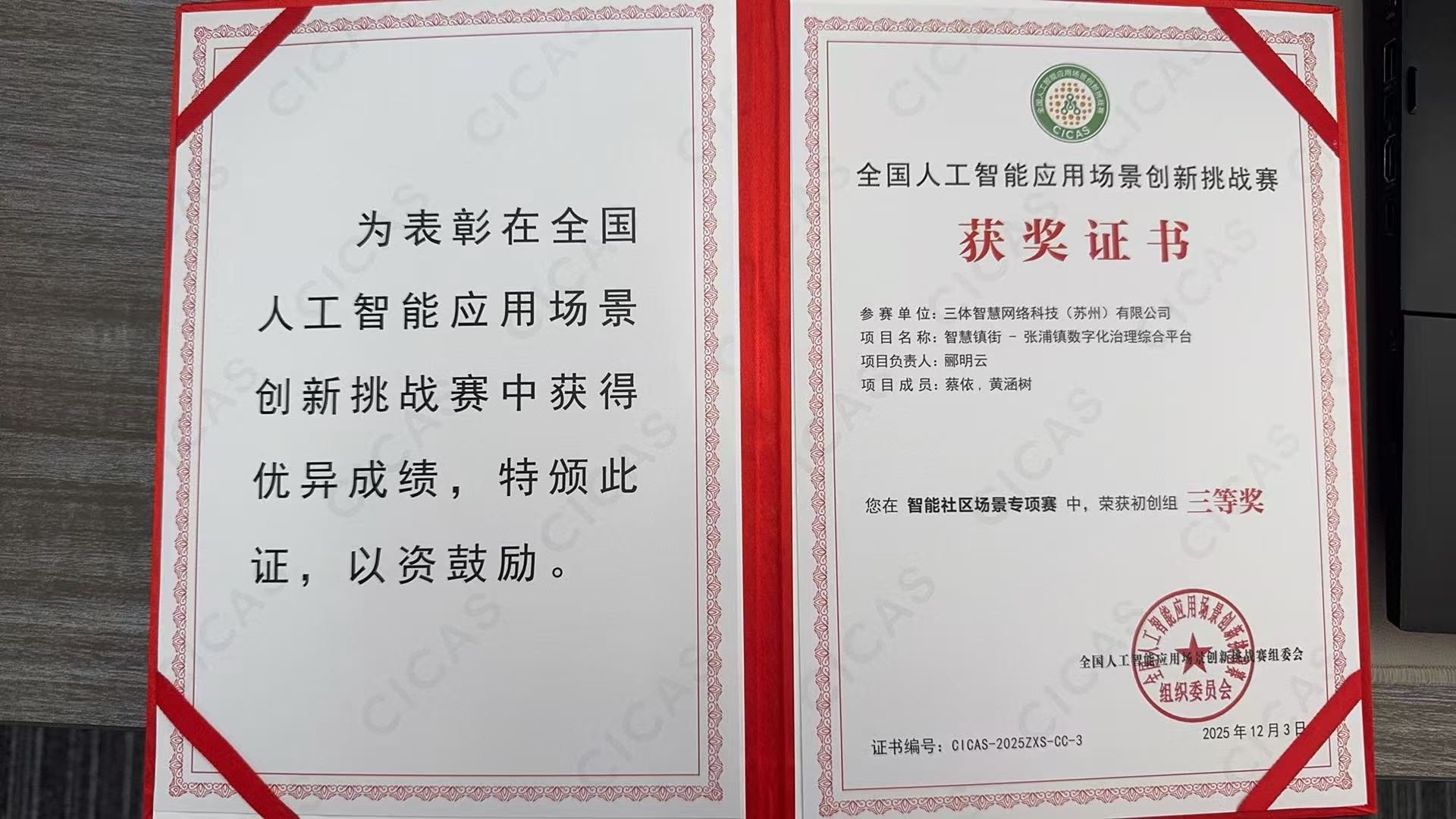 近日,在第三届全国人工智能应用场景创新挑战赛(CICAS)张江数链(元宇宙)专项赛中,昆山市张浦镇本土培育的高科技企业——三体智慧网络科技(苏州)有限公司联合张浦镇社会治理办公室倾力打造的“智慧镇街·张浦镇数字化治理综合平台”,与全国61支顶尖团队激烈角逐,最终脱颖而出,荣获全国三等奖。
