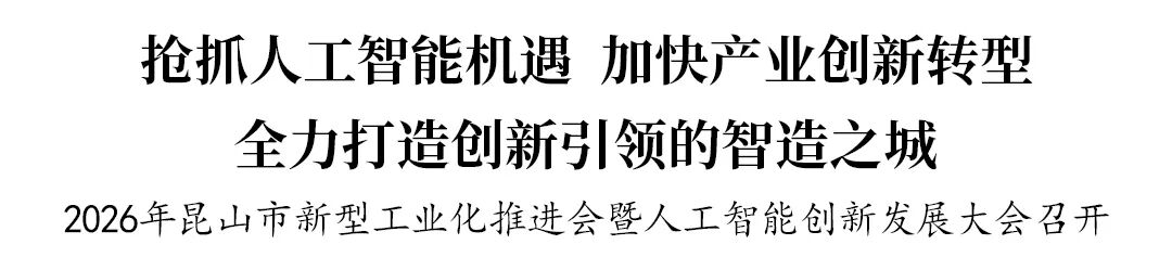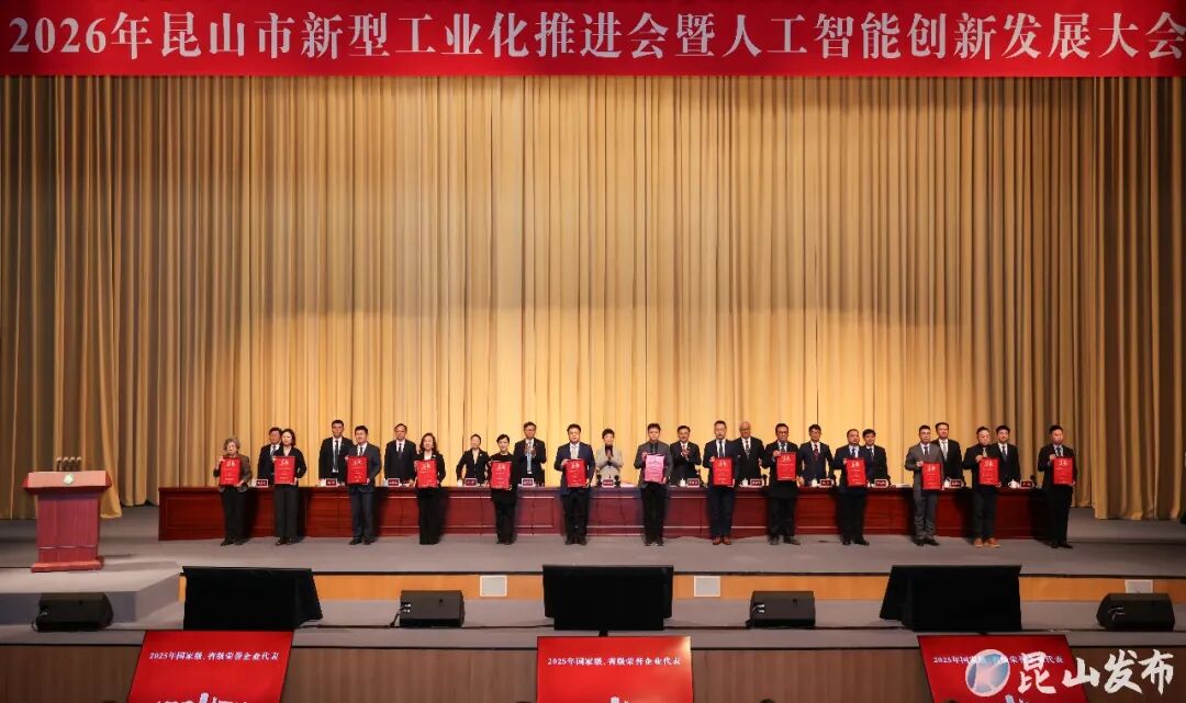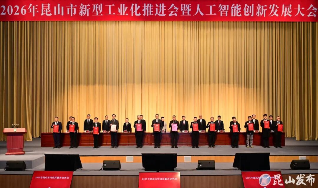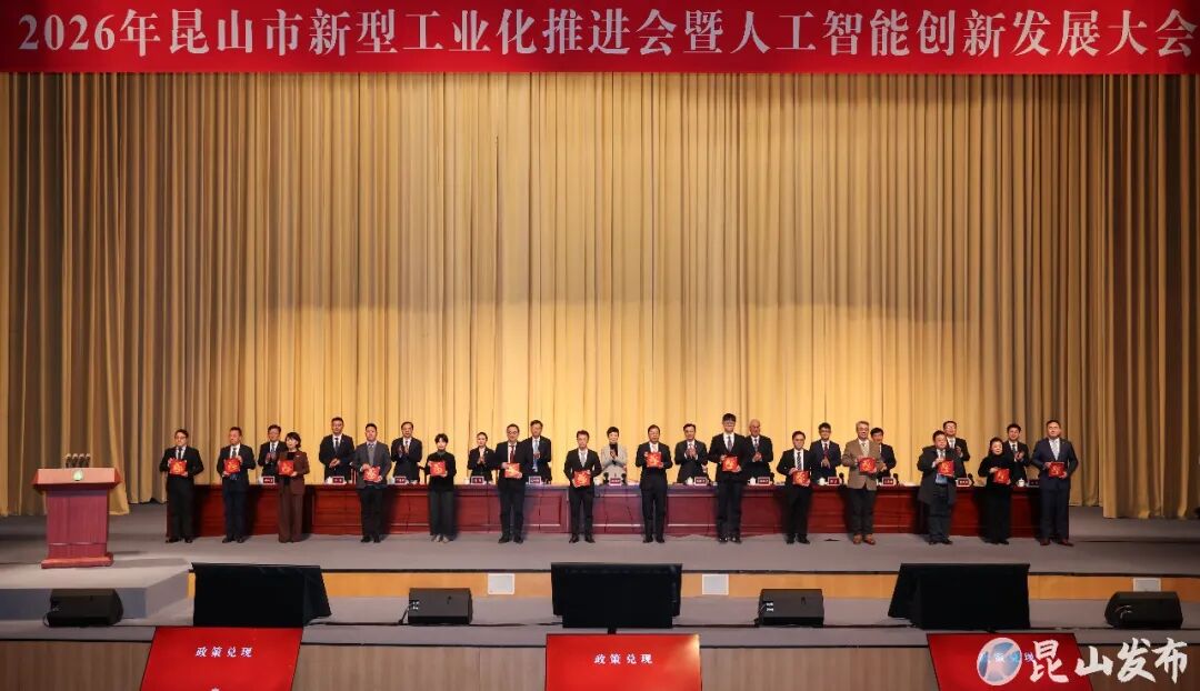 会上,解读了《昆山市推进新型工业化暨人工智能创新发展2026年行动方案》,展示了人工智能产业生态,发布了《昆山市2026年优化营商环境行动方案》,成立了昆山市人工智能产业基金、昆山市人工智能产业联盟。为2025年国家级、省级荣誉企业代表,2025年昆山市突出贡献企业代表进行荣誉授予。向一批企业兑现了政策。