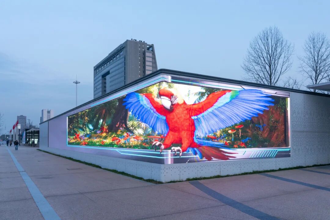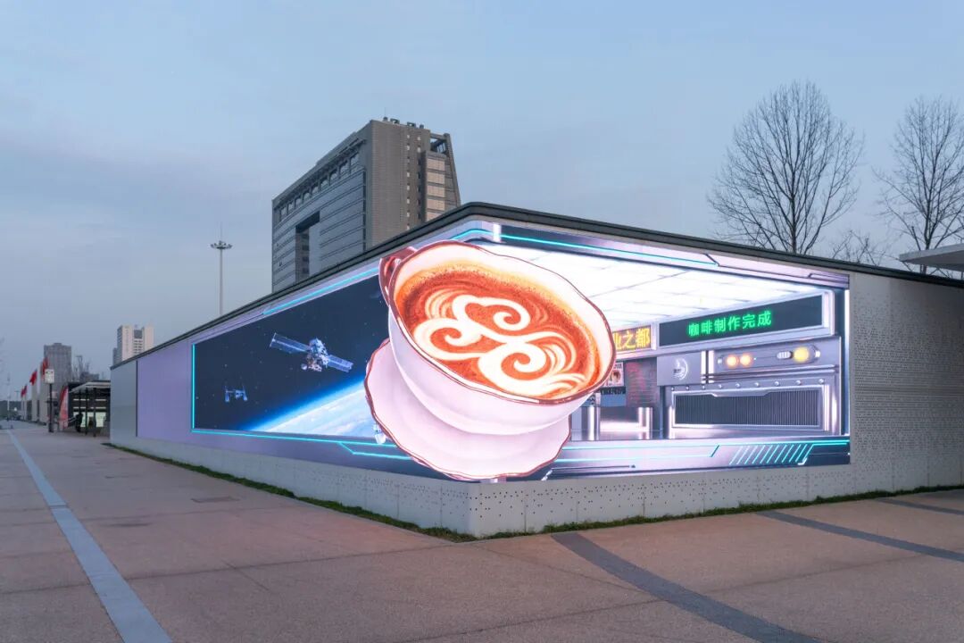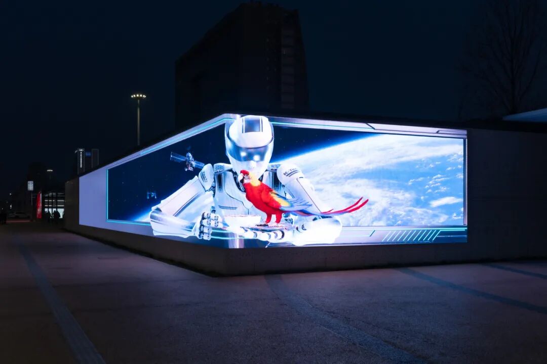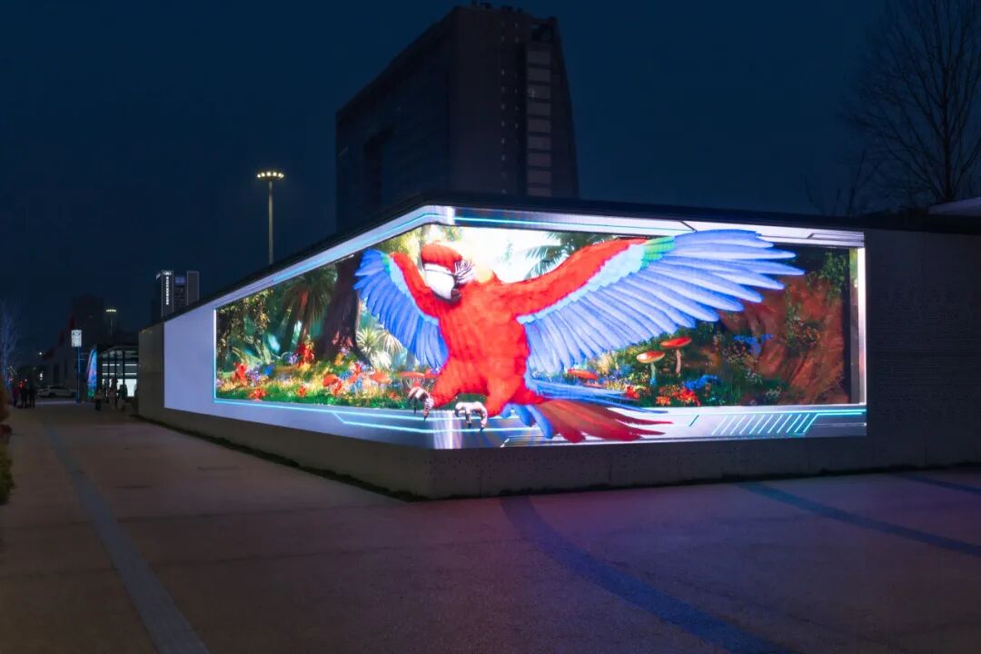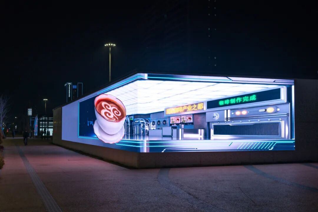 同时,针对LED折角屏的物理特性,团队通过三维投射技术进行视觉校准,使画面中的鹦鹉、机器人、咖啡果实等元素呈现出强烈的“破屏而出”之感,让市民无需佩戴任何设备即可享受沉浸式视觉体验。