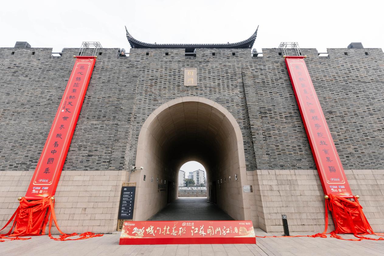 丙午马年新春,一副题为“马背驮春,直入江南,梅花绽放东吴韵;匠心铸福,遍贻天下,世界醉看中国年”的大红春联,高悬于苏州相门之上。蓝天白云映衬下,这一抹鲜亮的中国红点亮了古老城门,温暖了节日氛围,吟唱出江南的千年文脉与时代的开阔气象,更引来众人驻足围观、纷纷点赞。