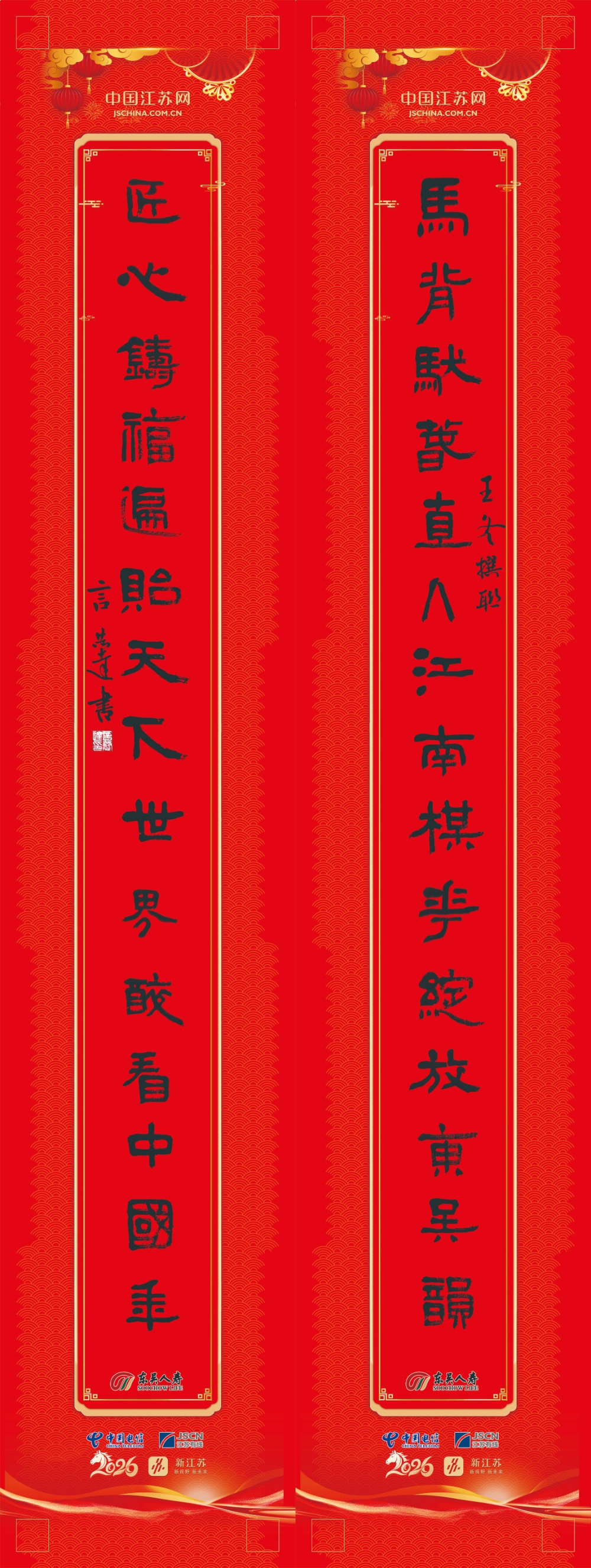 “马背驮春,直入江南”,联语起笔便见奇崛、浪漫与不凡,仿佛自带神韵。马所象征的奋进、开拓与活力,恰与新时代昂扬向上的脉搏同频共振。一个“驮”字、一个“直入”,既呼应了生肖之趣,又契合苏州灵动优雅的气质。炼字的精准,瞬间将无形的春光化作可感的具象,也将人们带入浓郁的春日氛围——骏马飞驰之景仿佛就在眼前,奋进如鼓的蹄声恰似响在耳畔。