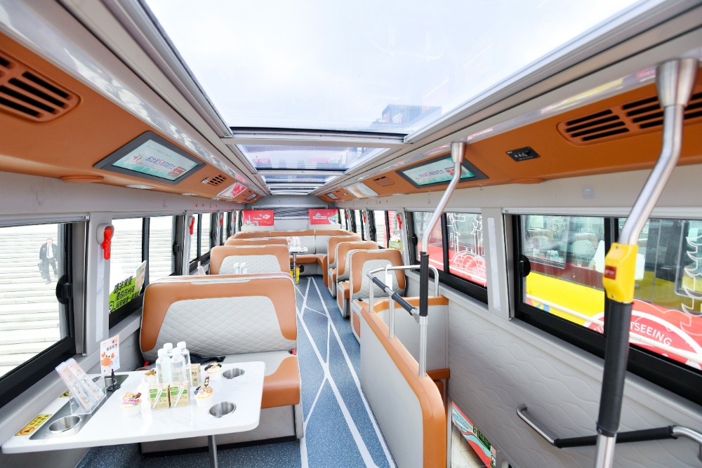 “私人定制”的双层巴士,是这条专线的亮点之一。巴士通体以红色为主基调,车身两侧绘有阅湖台、苏州湾文化中心等地标建筑,尾部附有专线运行地图。登上巴士,空间明亮通透,商务座椅宽敞舒适。巴士二层前排更是绝佳观景位,180度全景车窗毫无遮挡,安坐其中,湖景、街景“扑面而来”,给人留下深刻观览印象。