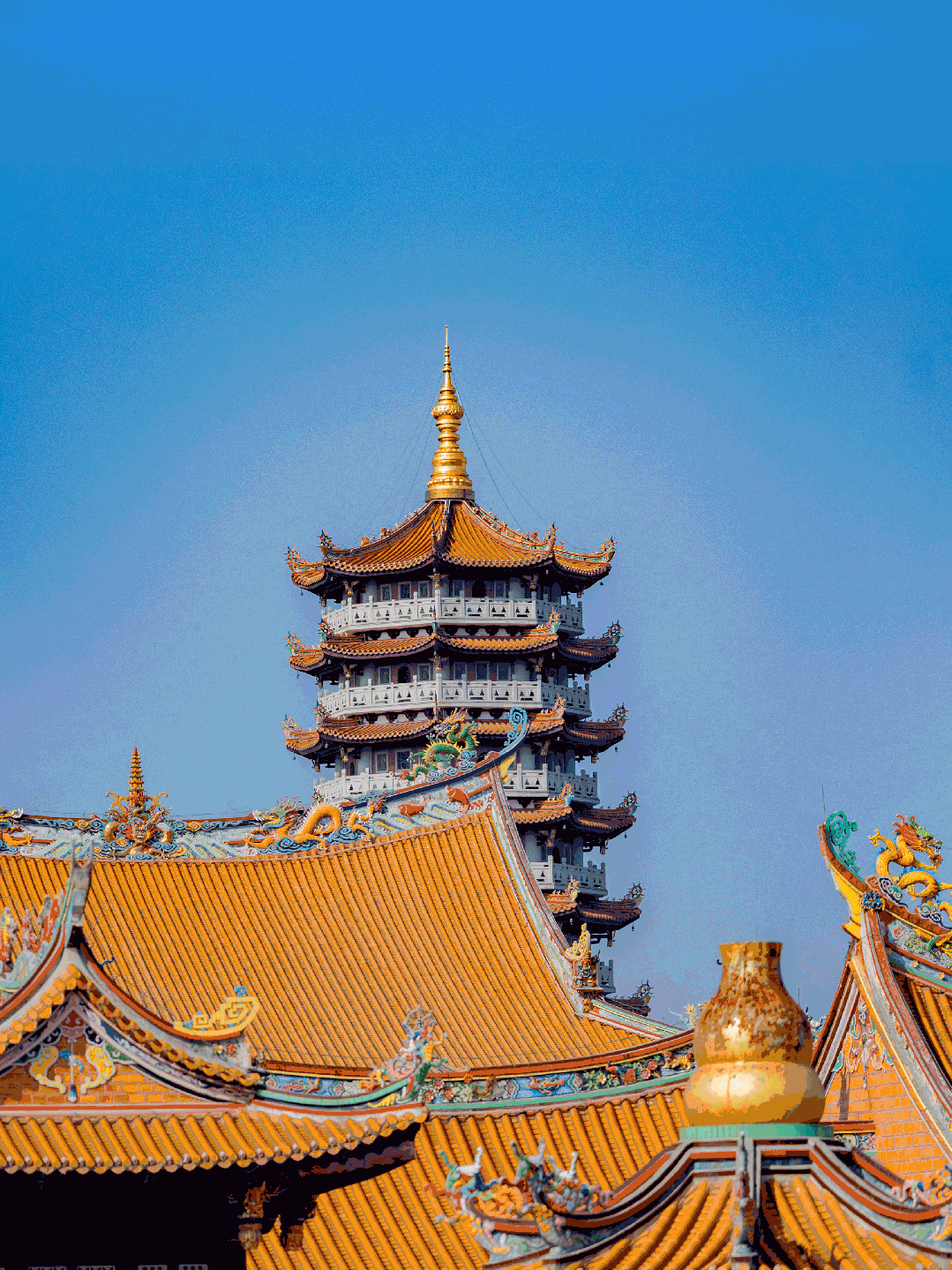 红墙金顶,燕尾脊飞扬,慧聚广场在春日的暖阳下闪闪发光。春花盛放,春风过处落英缤纷。
