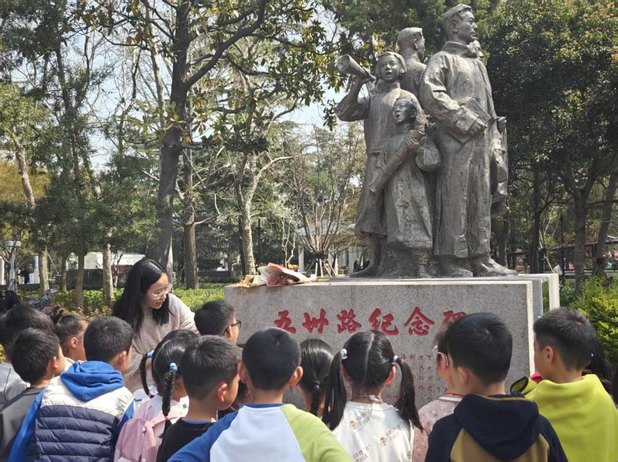 “五卅路纪念碑”静静矗立在苍翠梧桐树下,碑身不高,无声诉说着一整段沉重的岁月。花岗岩的纹理里,刻着九十年前的风雨与呐喊。“五卅路是全国唯一一条以五卅命名的道路。”讲解员刘雅文同学讲述着1925年五卅运动爆发后,苏州人民以各种方式声援和支持上海人民的斗争。一位父亲俯身对孩子说:“这条路的名字,是用烈士的血换来的。”铭记是为了更好地前行,孩子们送上鲜花,驻足凝视,向英勇的革命先烈致以最深切的敬意,在心里暗下决心“成长,成才,做一个对国家和社会有用的人,绝不辜负先烈的热血牺牲。”