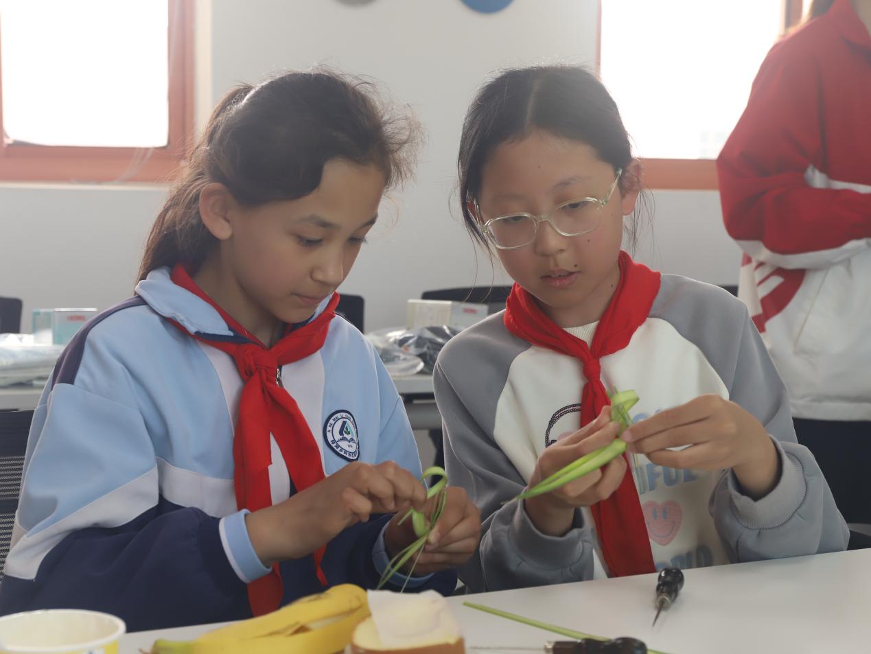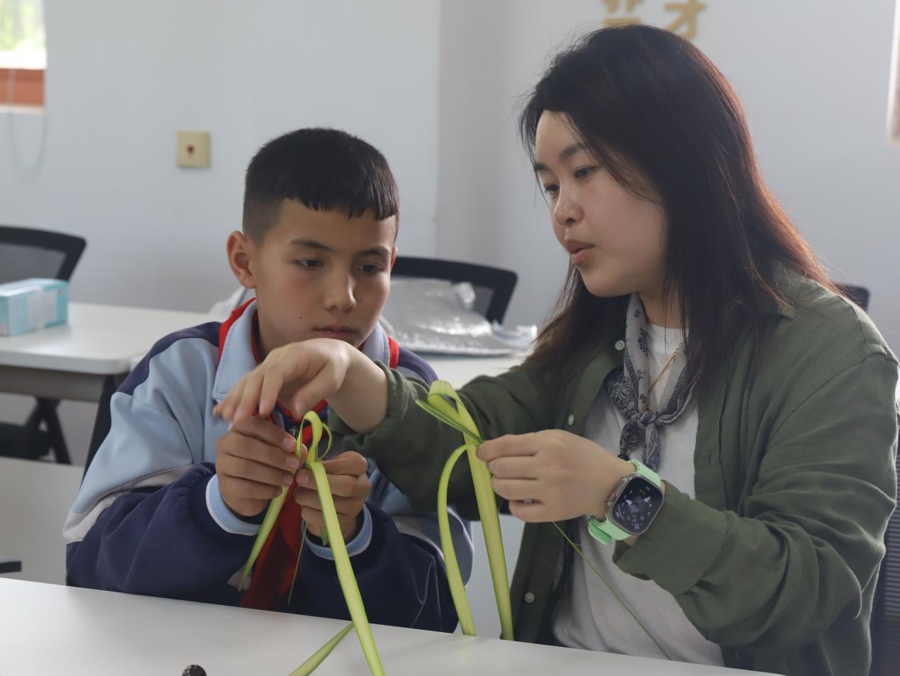 张浦中心校的非遗棕编课堂更是暖意融融。棕叶在指尖翻折缠绕,老师与学生、家长志愿者们手把手耐心教学。从手忙脚乱到编出翘着触须的灵动蚂蚱,新疆孩子们举着作品与伙伴相视大笑。非遗技艺的魅力在指尖传承,架起文化交融的桥梁。