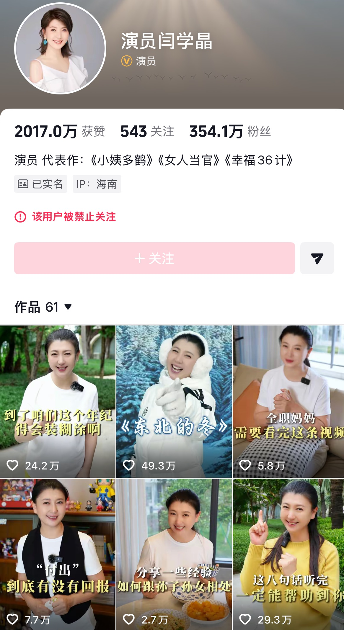 近日,演员闫学晶在直播中透露儿子拍一部戏“就挣几十万块钱”,而家庭每年的开支需要百八十万,若挣不够这些钱,家庭就难以正常运转。相关言论被质疑“哭穷”,不少网友表示“要抵制闫学晶代言产品”。随后,闫学晶多个短视频平台的账号被禁止关注,代言品牌连夜解约。曾经在《刘老根》里扮演质朴“山杏”的她,可能没想到一句所谓“家常吐槽”,会引发公众如此反感。