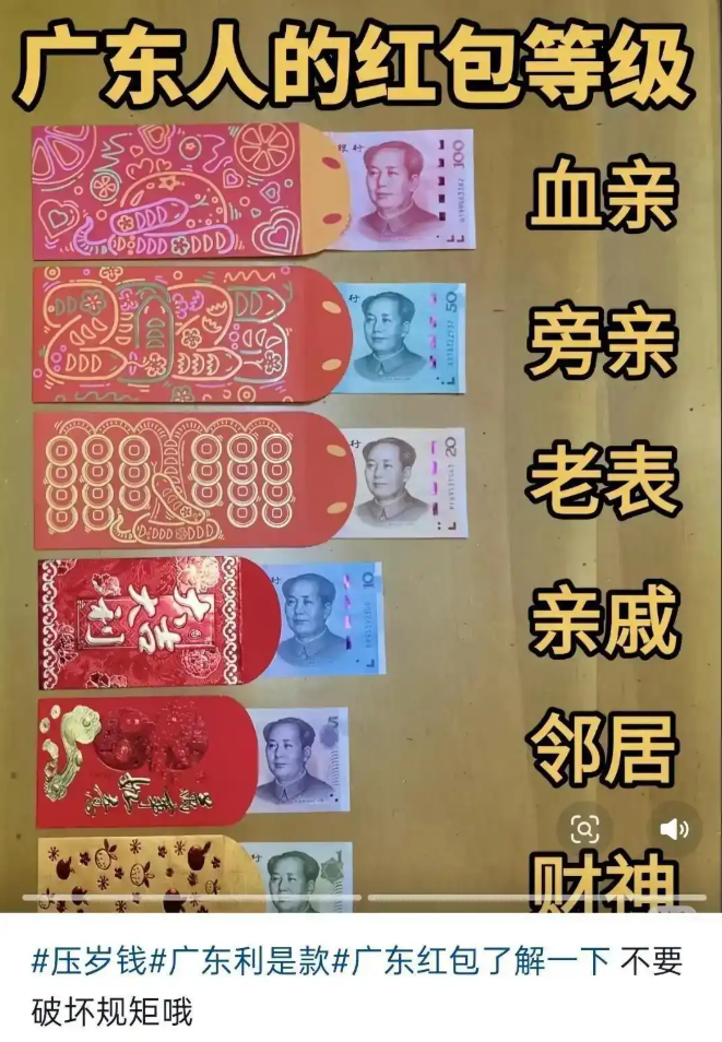 马年春节的脚步越来越近,年味也在街头巷尾的红灯笼、家家户户的备年货中渐渐变浓。近日,一张标注着“血亲100元、旁亲50元、老表20元、亲戚10元、邻居5元”的广东利是金额参考图,在微信朋友圈、抖音、微博等社交平台悄然走红。这张分级金额图并非官方制定的硬性规范,而是广东网友结合珠三角、粤东粤西粤北多年派利是习俗,自发整理的民间参考口径,发布后收获了网友的一致好评。