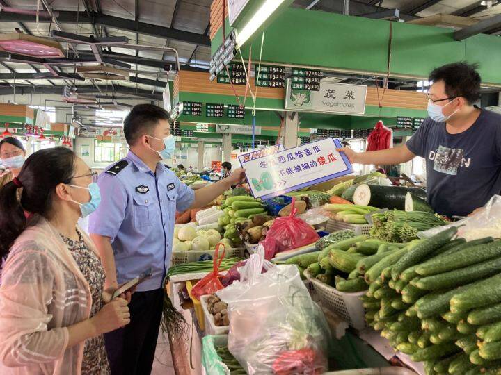 7月20日,公安医药高新区(高港区)分局创业园派出所民警走进辖区许庄农贸市场,着力打造“反诈菜场”,以幽默风趣、朗朗上口的顺口溜标语,推动反诈宣传入脑入心。