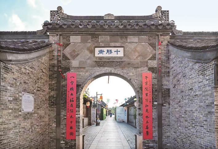 记者在现场看到,主体十胜街工程“修旧如旧”,风格古朴自然,功能完善多元,加上特色网红餐饮的入驻,吸引了众多市民前往打卡。在氤氲着历史氛围的十胜街上,一面“一眼千年墙”吸引了记者的注意。这面墙上贴着许多陶瓷、砖瓦碎片,以及牌坊构件,都是从附近地下发掘的,最早瓷片是唐代的,承载着该地块的厚重历史。